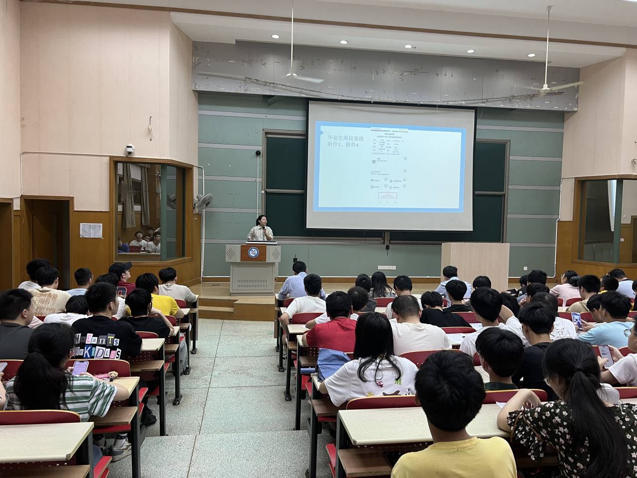 会上,学院学工办副主任万珊解读了学校2023届毕业生文明离校工作方案,就毕业生离校前党团组织关系办理、贷款事宜、毕业生评优、离校系统使用、“双证”领取等工作作详细讲解和答疑。