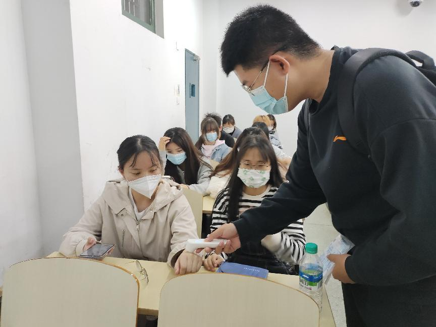 为方便同学、服务同学,学院团委纪检部立足本职工作,做到科学防疫,耐心地为同学们进行体温检测,将口罩分发到每一位同学的手中,并提醒同学们在公共场所记得戴好口罩,做好防护措施。