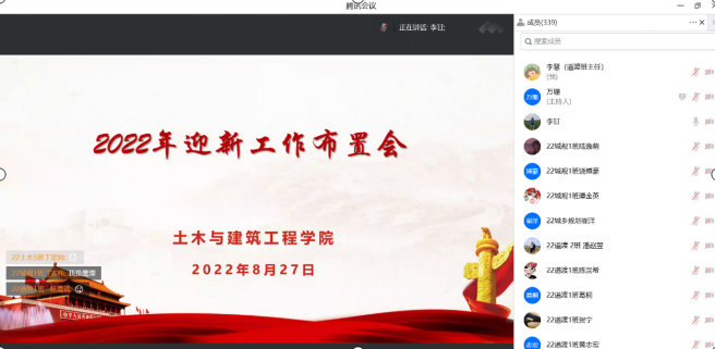 为了顺利开展学院新生开学报到相关工作,8月27日晚,williamhill威廉希尔中国在腾讯会议举行2022年迎新工作布置的线上会议。会议由学院党委副书记李甘主讲,学工办副主任万珊主持,学院各新生班班主任、辅导员李慧、2022级新生及其家长出席会议。