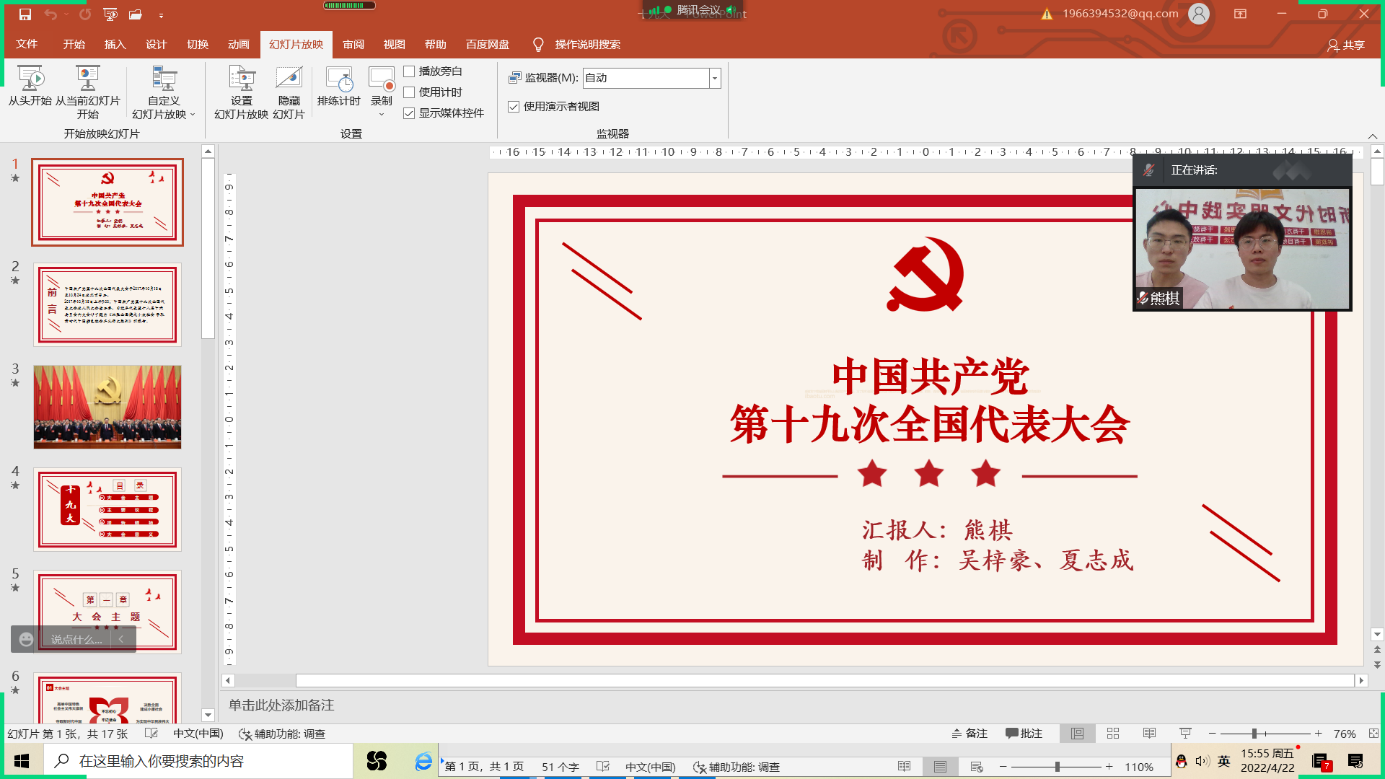 三名同志准备充分,围绕大会主题向大家详细介绍了中国共产党第十九次全国代表大会相关内容和重大意义。同时,鼓励团员青年发扬历史主动精神,以实际行动迎接党的二十大。