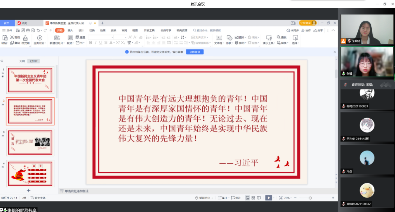 下午2时,活动开始。全体团员起立,高唱《光荣啊,中国共青团》。随后,两名学生党员作专题团课宣讲,围绕大会会议简介、主要内容、深远影响等内容,向线上的团员青年详细阐述了中国共产主义青年团第一次全国代表大会相关历史。张韫同志以习近平总书记对青年的寄语和所有支部团员共勉。“展望未来,我国青年一代必将大有可为,也必将大有作为。这是“长江后浪推前浪”的历史规律,也是“一代更比一代强”的青春责任。广大青年要勇敢肩负起时代赋予的重任,志存高远,脚踏实地,努力在实现中华民族伟大复兴的中国梦的生动实践中放飞青春梦想。”