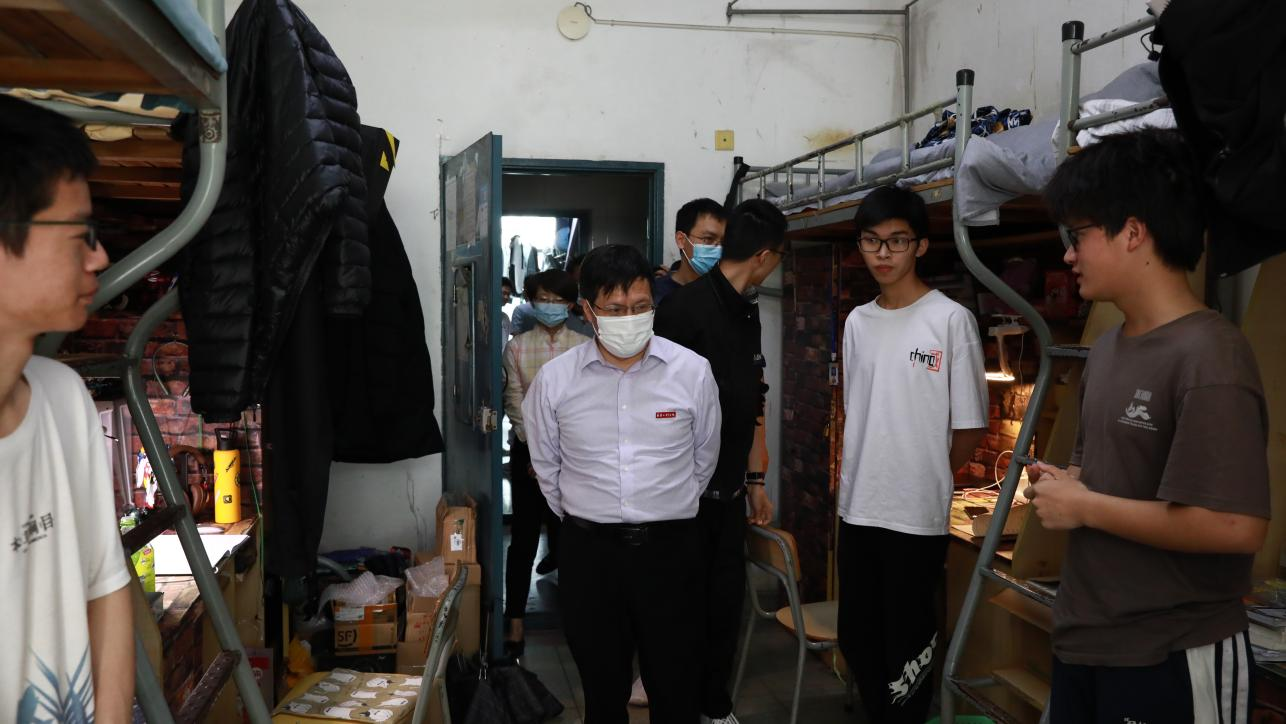 4月11日上午,校长汪胜前先后来到学生社区8栋、11栋学生宿舍,走访看望在校学生。