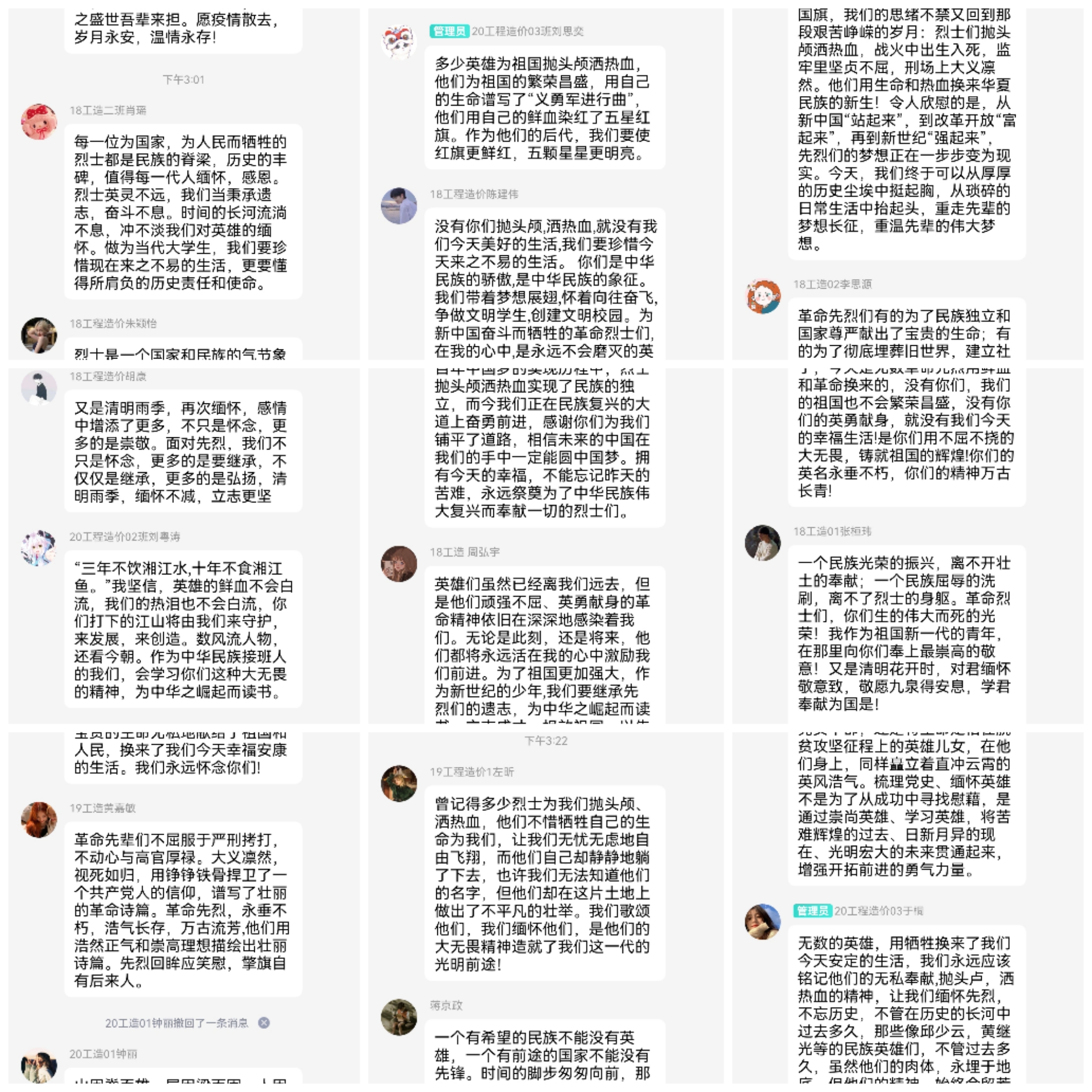 会议伊始,大家齐聚网络,默然肃立、沉痛哀悼烈士英魂。随后,大家就“2022·奋进·网上祭英烈”主题团日活动发表自己的看法。参与活动的青年们纷纷发言,表示一定要铭记烈士们的遗愿,永志不忘老一辈无产阶级革命者为之流血牺牲的伟大理想,要以优异的成绩回报革命先烈给我们带来的幸福生活,并把对先烈的无限缅怀和对英雄的无尽敬仰化为现实中不懈前进的动力。活动最后,大家满怀敬意云端祭扫,留下清明寄语,深切缅怀革命先烈。