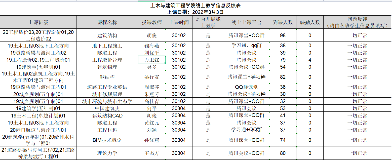为保证教学工作有条不紊的运行,学院及时拟定线上教学检查和督导方案,由学院领导和教研室主任组成的线上教学检查专项工作小组、教授或副教授组成的学院二级督导小组、以及各班级学委组成的教学信息反馈小组,三管齐下,多渠道多方位地收集每日线上教学课程开设、管理运行、意识形态、教师考勤、学生管理等信息,做到当日反馈、当日解决,建立起及时有效、科学互动的教学信息传达和反馈渠道,教学秩序井然。