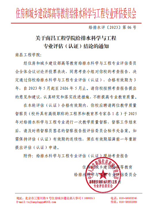 近日,我院收到住房和城乡建设部高等教育给排水科学与工程专业评估委员会《关于南昌工程学院给排水科学与工程专业评估(认证)结论的通知》(给排水评〔2023〕第06号)通知,给排水科学与工程专业通过住房和城乡建设部高等教育给排水科学与工程专业评估(认证),合格有效期为3年,自 2023 年 5 月起至 2026 年 5 月止。(文/图 王敏)