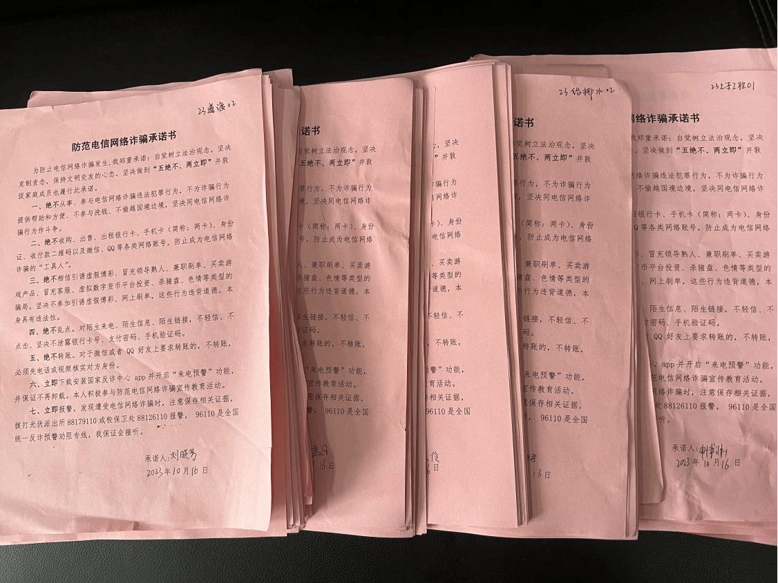 会上,各班级班长向每位同学发放了《防范电信网络诈骗承诺书》,带领同学们认真学习承诺书内容,共同了解电信网络诈骗的常见手段,号召全体同学要自觉增强网络安全意识和对骗术的鉴别能力。随后,各班组织开展《防范电信网络诈骗承诺书》签订活动,每位同学都在承诺书上郑重地签上自己的名字。