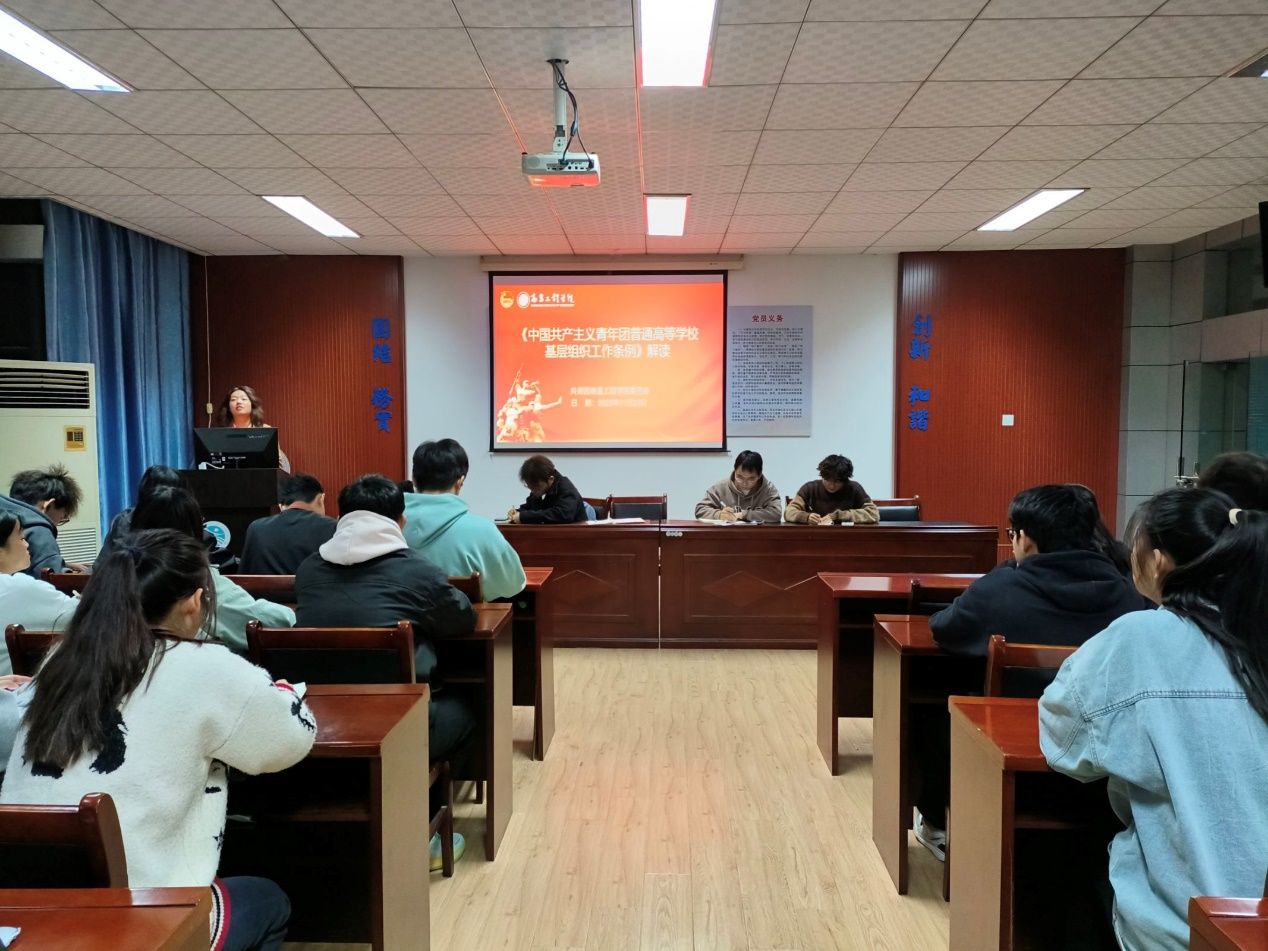 会上,万珊领学了《条例》全文,详细解读《条例》中高校基层团组织的指导思想、工作原则、组织设置、工作职责和队伍建设等内容。同时,希望广大团学干部能够认真学习领会《条例》中对高校基层团组织的工作要求,结合工作与学习实际,争做“有理想,敢担当,能吃苦,肯奋斗”新时代青年。(文/图 蔡亲华)