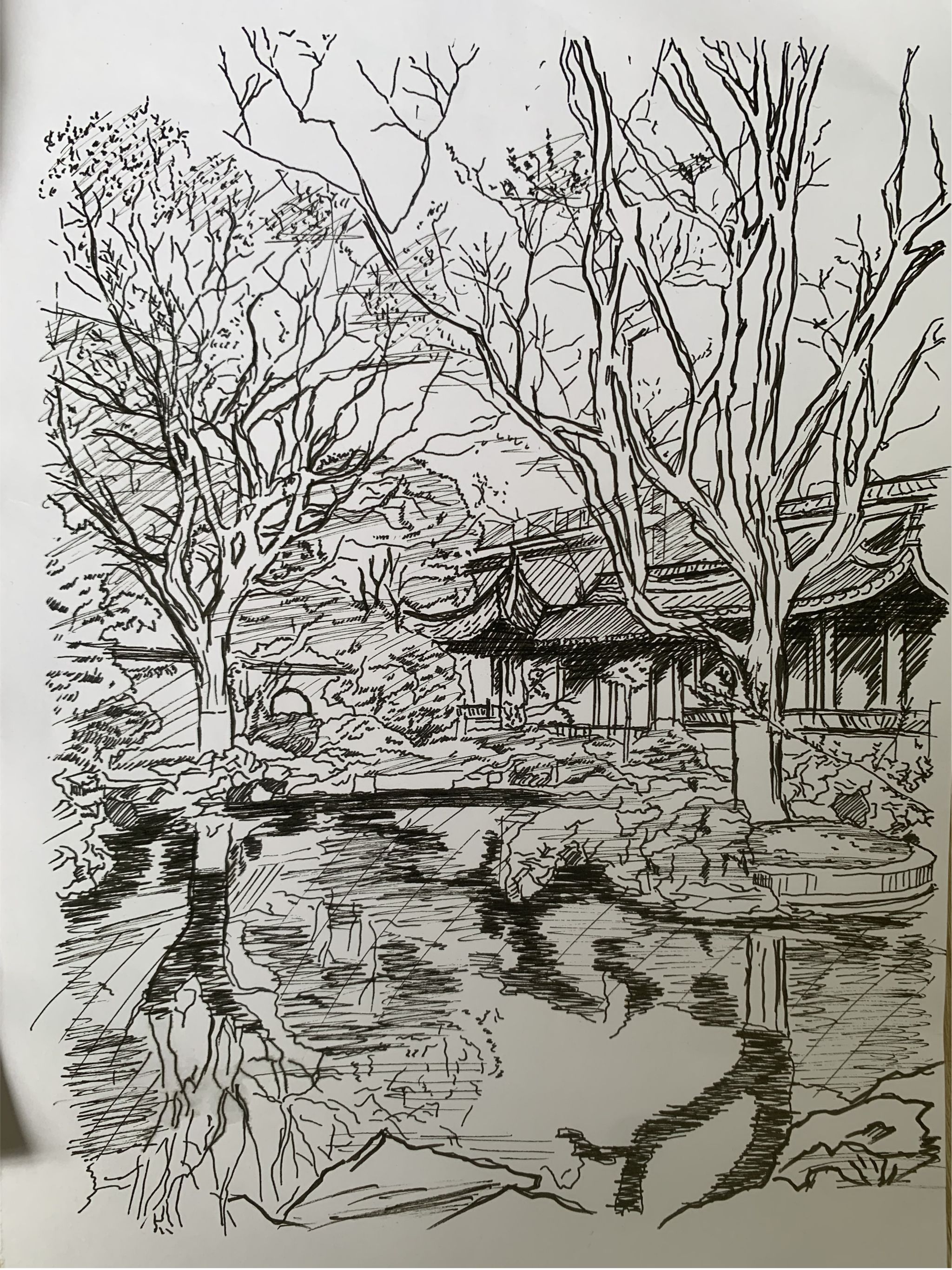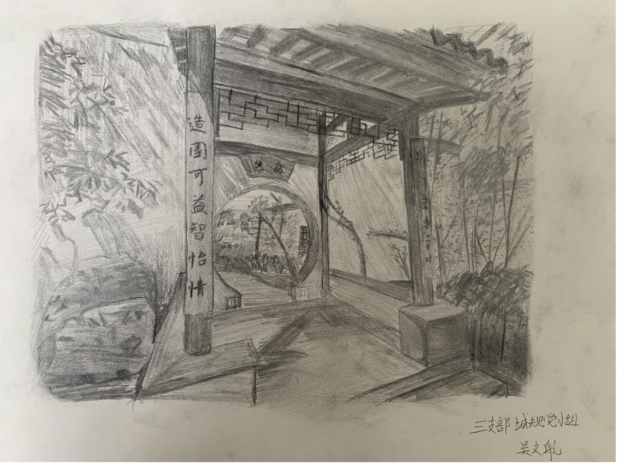 随后,在学校样板支部、土建学院第三学生党支部党员周运清的指引下,同学们依次参观位于南昌市福州路的豫章景园。他从专业的角度,详细介绍了豫章景园的营造特征,包括园林布局、建筑特征、营造手法等,同时,大家结合自身专业,现场绘制出了一幅幅园林景观素描图。