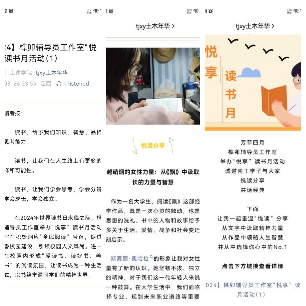 3月26日-4月23日,在世界读书日之际,榫卯辅导员工作室开展“悦享”读书月活动,活动以线上推文连载形式分享大学生读书心得。