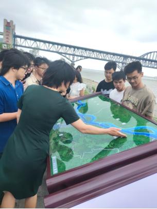 师生党员共同参观了长江国家文化公园九江城区段的施工。在工程现场,项目部熊主任详细介绍了长江干流江西段崩岸应急治理工程、长江国家文化公园的建设和长江岸线生态修复等情况,现场参观的党员们对公园建筑结构和设计布局进行了深入讨论。