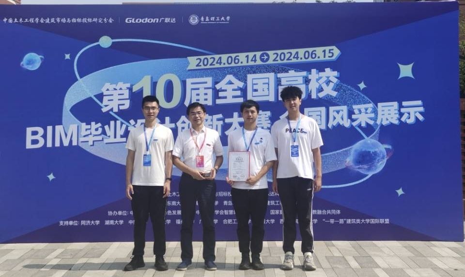 6月14-15日,备受瞩目的第十届全国高校BIM毕业设计创新大赛全国风采展示活动在青岛理工大学举办,该活动由中国土木工程学会建筑市场与招投标研究分会、广联达科技股份有限公司主办,东南大学、华南理工大学、青岛理工大学和重庆建筑工程职业学院共同承办。我校一等奖获奖团队受邀参加风采展示活动,和行业专家、评委代表,以及全国各高校一等奖团队师生共聚一堂,共同交流参赛心得和经验。这是我校首次参加该项赛事并获得全国一等奖。