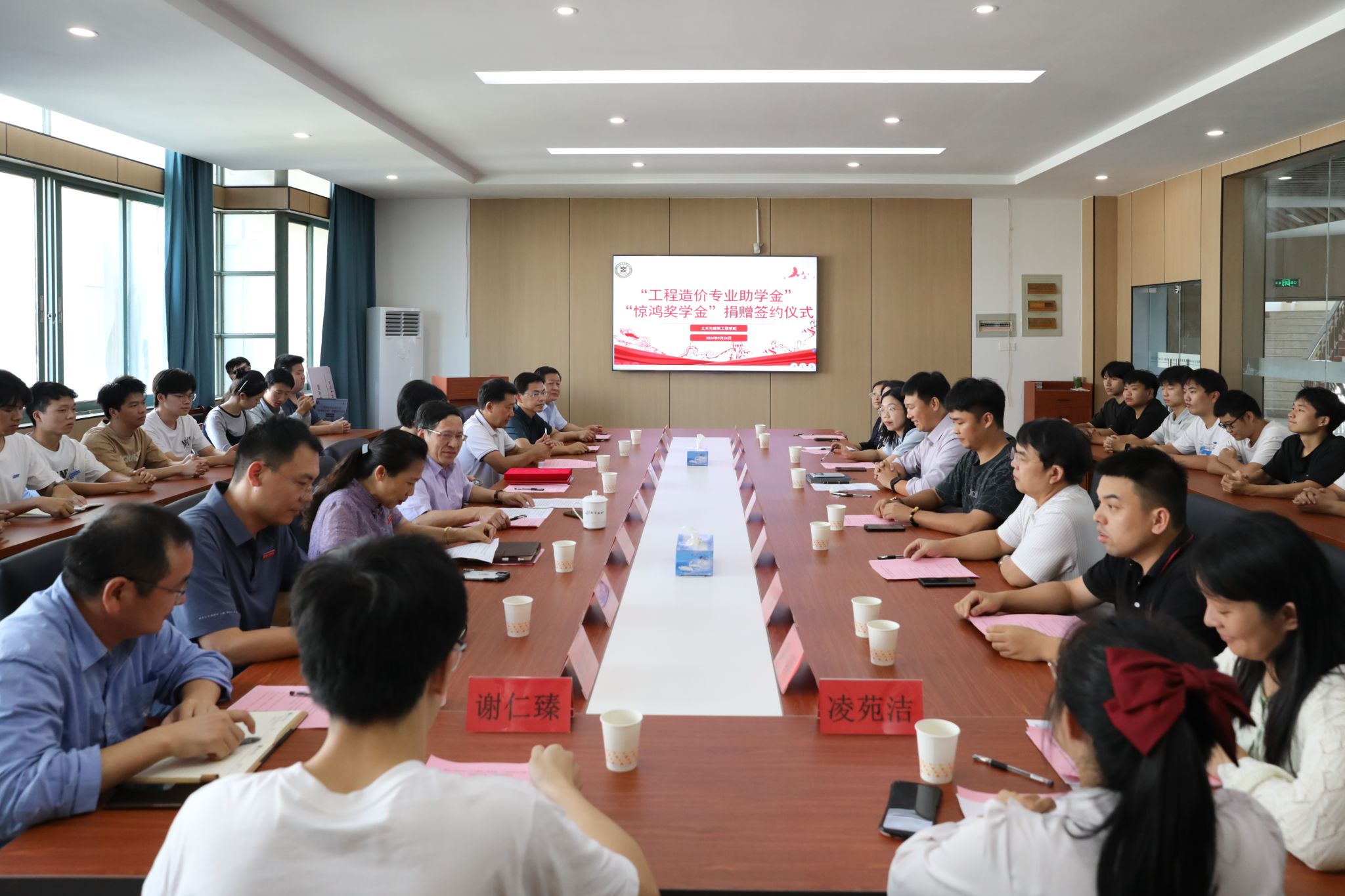 9月24日,williamhill威廉希尔中国“工程造价专业助学金”、“惊鸿奖学金”捐赠签约仪式在土建楼 B313 会议室隆重举行,南昌工程学院党委书记汪胜前、江西省南昌工程学院教育发展基金会副理事长兼秘书长田红敏、2001级工程造价专业校友崔剑、周睿迪、2018级道路桥梁与渡河工程校友罗林、williamhill威廉希尔中国党政领导班子成员及师生代表共40余人参加仪式。