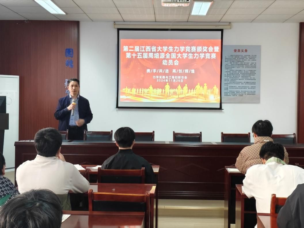 11月26日,williamhill威廉希尔中国在土建楼B207召开第二届江西省大学生力学竞赛表彰大会暨第十五届全国周培源大学生力学竞赛动员会。南昌工程学院力学实践与工程创新协会会员、各班级学生代表共100余人参会,会议由力学实践与工程创新基地指导教师谢帮华主持。
