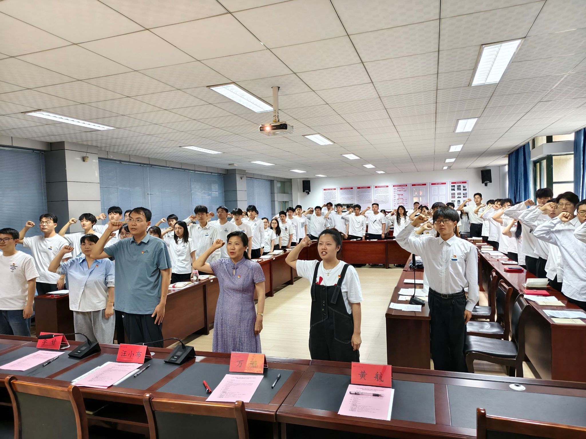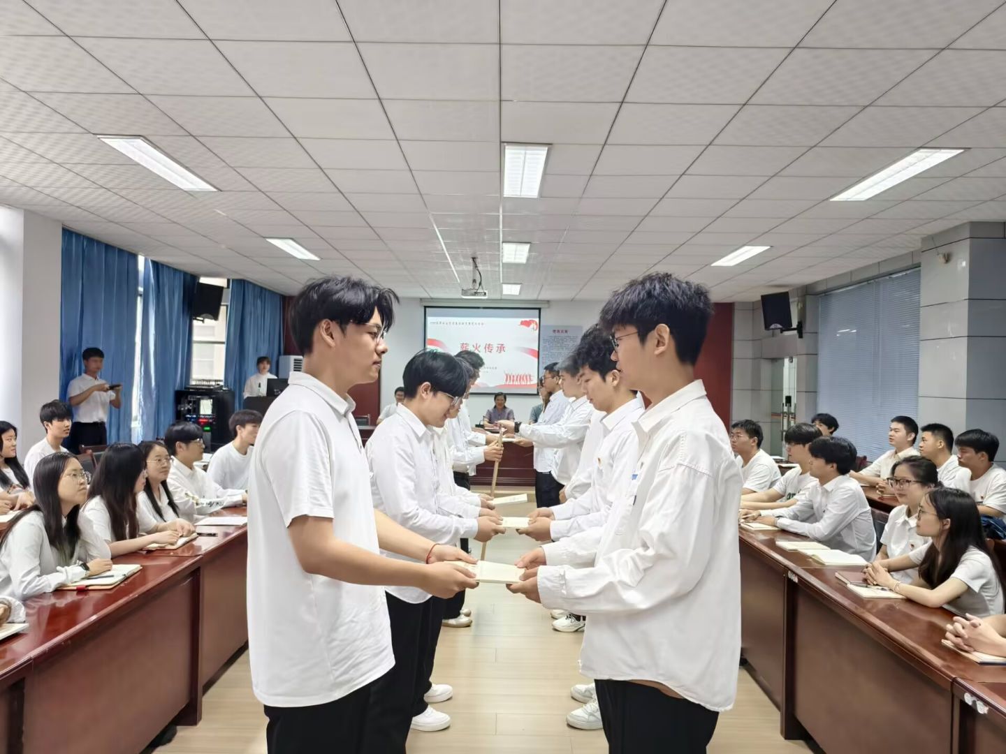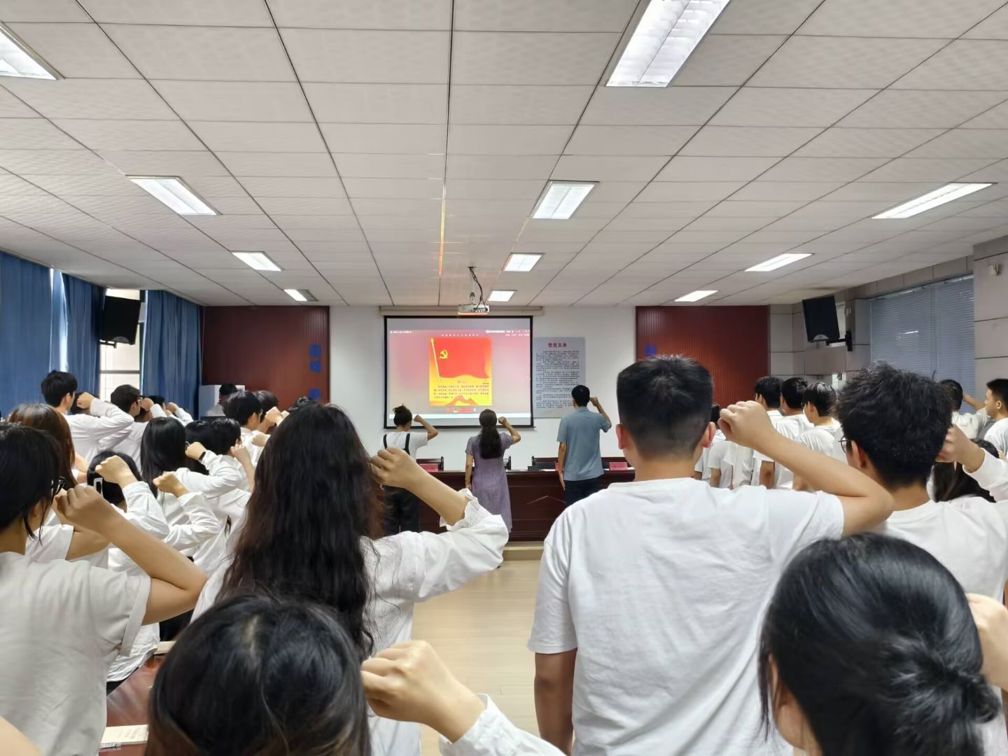 活动紧扣主题,在“擎旗砺行”环节,李甘郑重地朗读了饱含深情的“致毕业生党员的一封信”,承载着学院对毕业生党员的深情厚谊与殷切嘱托。在“弘誓固魂”环节,第三学生党支部书记领誓,全体党员整齐列队,举起右拳,重温入党誓词。铿锵有力的誓词回荡在会场上空,进一步坚定了毕业生党员的理想信念。正式党员和预备党员代表随后分享了成长故事与入党心得,以真挚感悟筑牢理想信念之基。“薪火传承”环节洋溢着温情与力量。学长学姐精心整理书籍、丁字尺和画板等学习用品,将其传递给新入党党员,以实物承载知识经验,以行动诠释使命接力。在“青荫传志”环节,学院倡议毕业生党员自愿参与“认捐一棵树,留下一生情”校友林捐赠项目。全体2025届毕业生党员积极响应,自愿“认捐一棵树”,为校园添绿的同时镌刻奋斗印记。在“帧载华章”环节,全体党员合影留念,定格难忘瞬间,展现党员队伍昂扬向上的精神风貌。