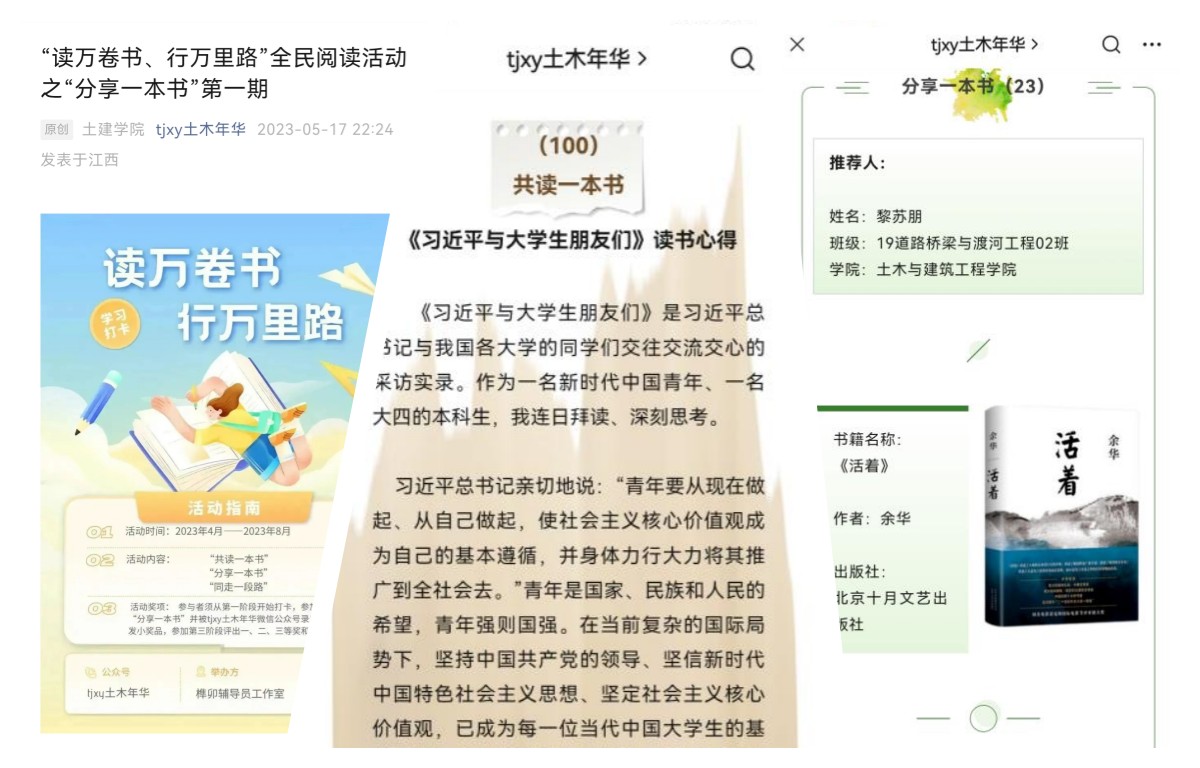 在此活动中共分三个阶段,“分享一本书”、“共读一本书”、“同走一段路”。截止目前,收到投稿600余篇,“共读一本书”至今发布了23期,“分享一本书”已发布6期。后续将以线下打卡红色地点的方式形成“同走一段路”的成果。